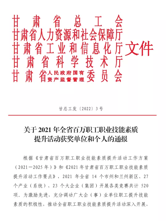 1月21日,甘肅省總工會、省人力資源和社會保障廳、省工業(yè)和信息化廳、省科學技術廳、省人民政府國有資產(chǎn)監(jiān)督管理委員會聯(lián)合公布了《關于2021年全省百萬職工職業(yè)技能素質提升活動獲獎單位和個人的通報》,石化集團專精特新公司孫占棟、劉恒、林占強、駱振璽、劉恒5名職工榮獲“2021年甘肅省技術標兵”稱號。