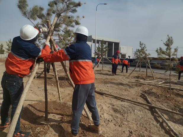活動(dòng)中,廠區(qū)內(nèi)部到處都是緊張有序的勞動(dòng)景象,參加植樹的干部職工個(gè)個(gè)配合默契、干勁十足,有的拿鐵鍬,有的運(yùn)樹苗,你追我趕,比干勁、比進(jìn)度,各個(gè)環(huán)節(jié)銜接有序?;顒?dòng)現(xiàn)場共栽植棗樹、杏樹、松樹等600余棵。