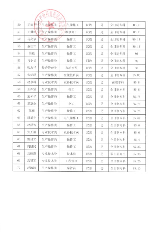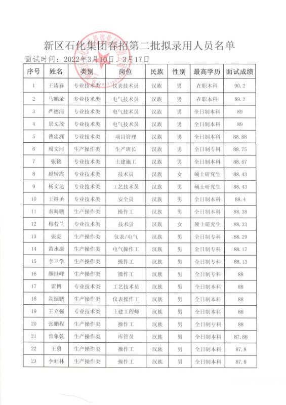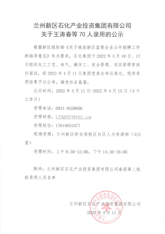 蘭州新區(qū)石化產(chǎn)業(yè)投資集團(tuán)有限公司關(guān)于王濤春等70人錄用的公示