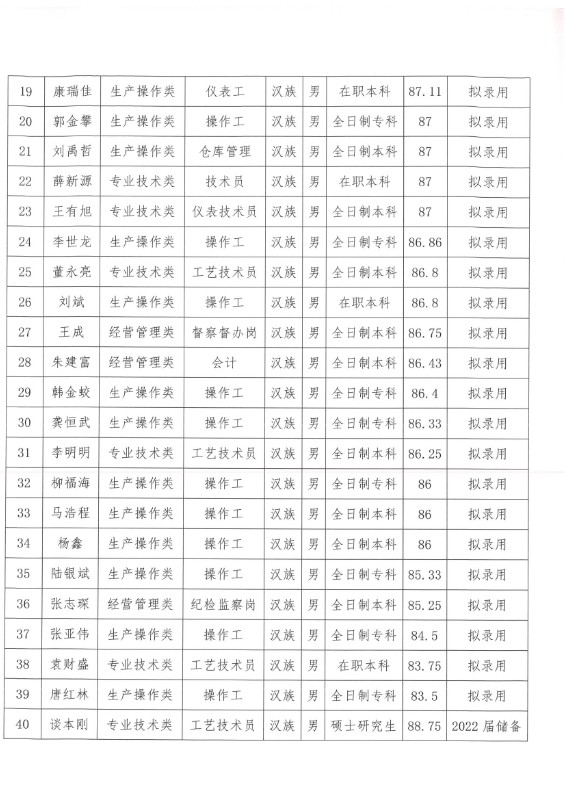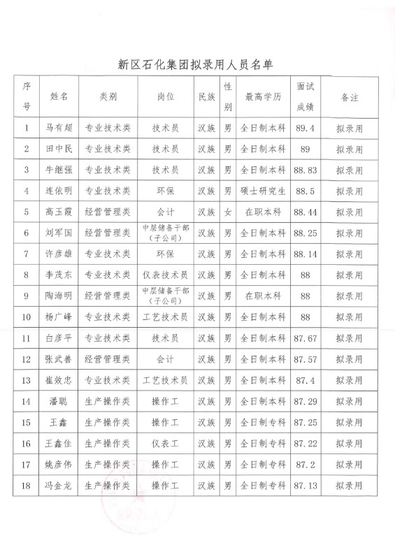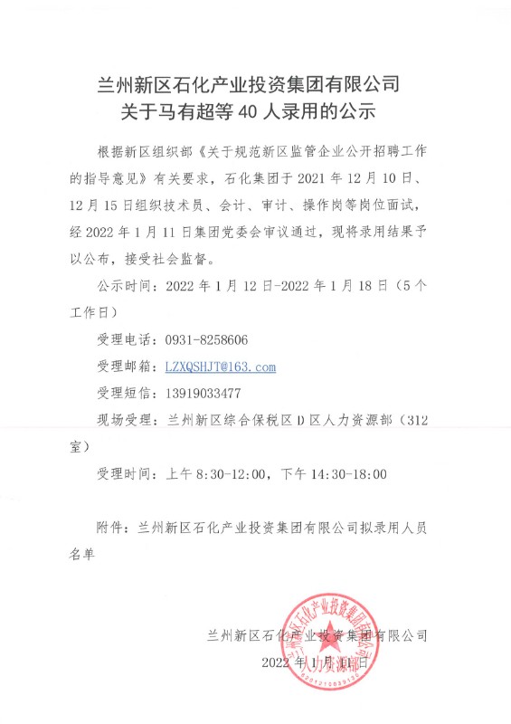 蘭州新區(qū)石化產(chǎn)業(yè)投資集團(tuán)有限公司關(guān)于馬有超等40人錄用的公示
