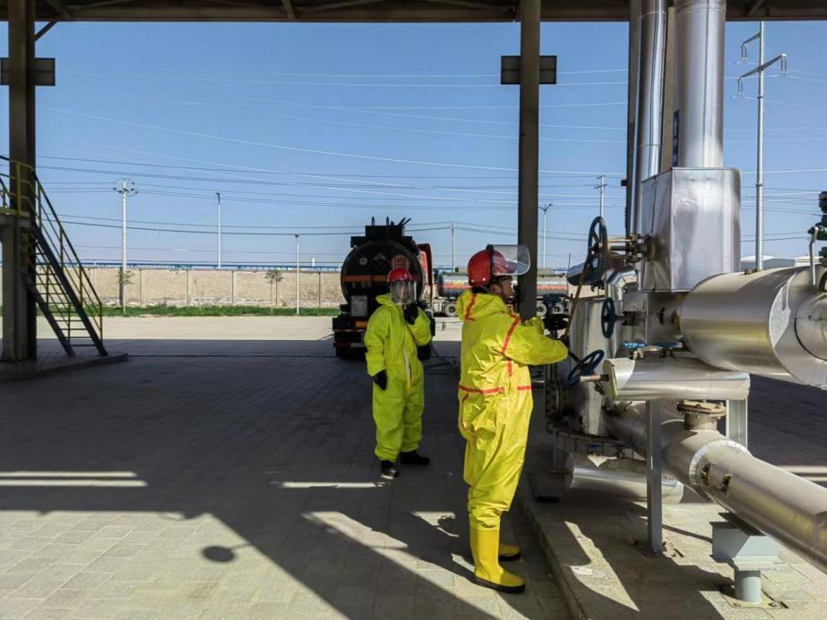 化工商貿公司物流園貨場的裝卸外操人員因工作需要,須與貨運外來司機接觸,對于這種特殊情況,物流園項目部劃定裝卸區(qū)域和倉庫為裝置疫情“高風險區(qū)”,只有準許人員方可進入。為確?;@區(qū)各生產(chǎn)企業(yè)原料及時進廠,化工原材料有序出廠,物流園貨場開啟“全天候待機”模式,這兩個區(qū)域的在崗員工全部是24小時全天候值班。不管是深夜還是清晨,只要接到裝卸車任務,他們組織有序,行動迅速,第一時間趕到裝卸現(xiàn)場,完成酸堿裝卸作業(yè)。