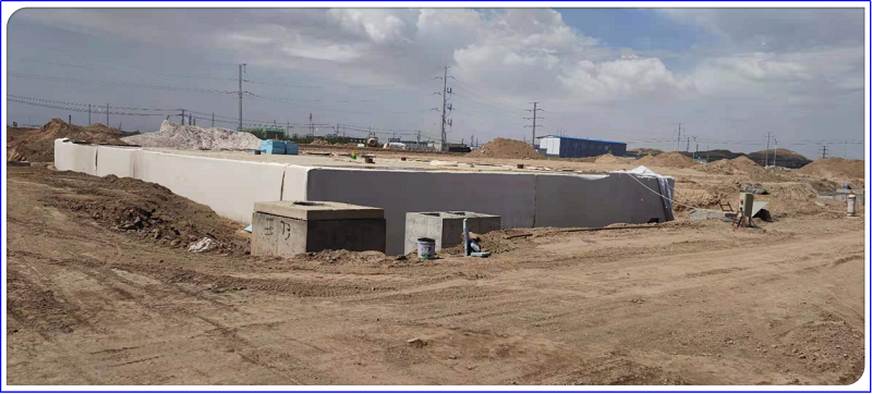 廢水處理站由初期雨水池(有效容積490m3)和事故水池(有效容積1715m3)組成。池壁、底板、頂板通過三層長絲無紡土工布,兩層土HDPE土工膜做防腐防滲處理。水池注水至雨水池和事故水池連接處,沉降觀測一周,池主體無滲漏后用潛水泵抽水放至現(xiàn)場。水池閉水過程嚴格按照閉水方案進行,并制定了防水現(xiàn)場應急處置措施。