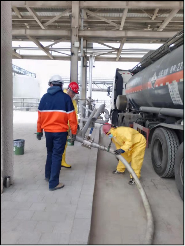 正式作業(yè)前,項目各班組人員對汽車輸送泵、堿液罐區(qū)氣動調(diào)節(jié)閥等進(jìn)行檢測試驗,對工藝流程中法蘭、管道等進(jìn)行周密檢查,多次確認(rèn)。各專業(yè)人員緊密配合,協(xié)同工作,為堿液順利進(jìn)料做好充分準(zhǔn)備工作。隨著裝滿堿液的罐車緩緩駛?cè)胛锪鲌@貨場裝卸棧臺,班組各崗位人員認(rèn)真落實安全措施,嚴(yán)格按照操作流程進(jìn)行進(jìn)料作業(yè),堿液儲罐順利完成首次進(jìn)料。