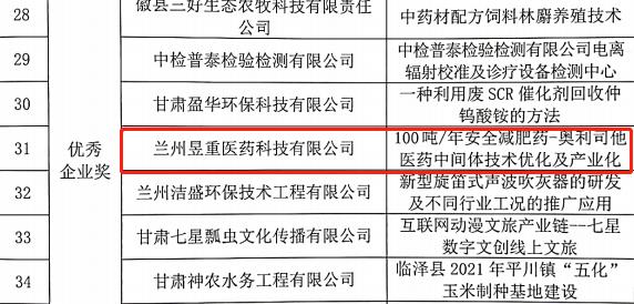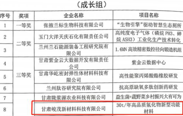 近日,從第十一屆中國創(chuàng)新創(chuàng)業(yè)大賽(甘肅賽區(qū))組委會獲悉,蘭州新區(qū)專精特新化工產業(yè)孵化基地的兩家入駐企業(yè)——甘肅峻茂新材料科技有限公司和蘭州昱重醫(yī)藥科技有限公司分別榮獲第十一屆中國創(chuàng)新創(chuàng)業(yè)大賽(甘肅賽區(qū))優(yōu)秀企業(yè)獎。