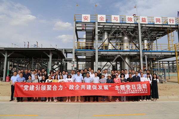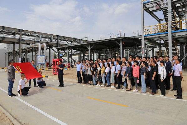 活動伊始,全體黨員俯瞰了化工園區(qū)整體建設(shè)情況,工作人員對石投集團(tuán)全力打造的基礎(chǔ)配套設(shè)施管理運(yùn)營、專精特新廠房集聚帶動、科技工程示范引領(lǐng)三大特色產(chǎn)業(yè)板塊進(jìn)行了全面介紹。全體黨員走進(jìn)石投集團(tuán)專精特新產(chǎn)業(yè)園A區(qū)標(biāo)準(zhǔn)化專用廠房,看到了眾多入駐企業(yè)安裝設(shè)備、試車投產(chǎn)的火熱景象。在液態(tài)陽光示范項(xiàng)目現(xiàn)場,近距離參觀了解全球首套千噸級規(guī)模太陽燃料合成示范項(xiàng)目,并在項(xiàng)目現(xiàn)場,全體黨員面對鮮紅的黨旗,莊嚴(yán)地高舉右拳,鏗鏘有力地重溫入黨誓詞,將共產(chǎn)黨員的榮耀、責(zé)任和使命牢牢銘記在心中。
