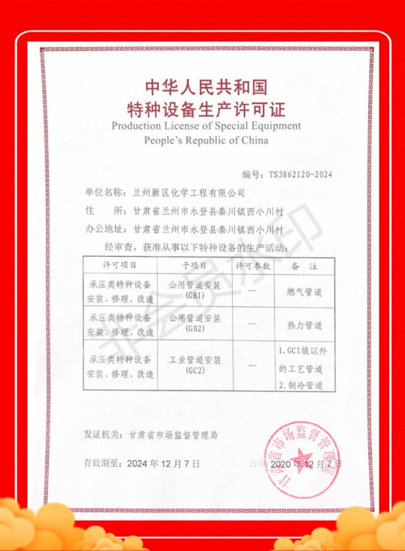 2020年12月7日,石投集團(tuán)化學(xué)工程公司順利取得了由甘肅省市場監(jiān)督管理局批準(zhǔn)的《特種設(shè)備壓力管道安裝許可證》,該許可證是新區(qū)首個(gè)壓力管道安裝許可證。