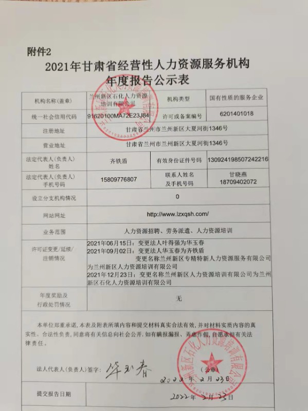 根據(jù)甘肅省人力資源和社會保障廳《關于開展2021年度全省經(jīng)營性人力資源服務機構年度報告公示工作的通知》(甘人社通〔2022〕44號)文件要求,現(xiàn)對蘭州新區(qū)石化人力資源培訓有限公司2021年度報告進行公示,接受社會監(jiān)督。詳見年度報告公示表。