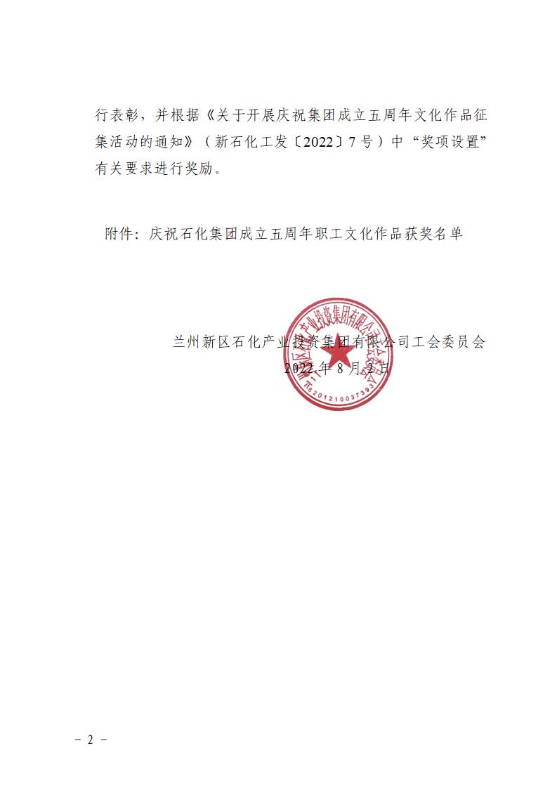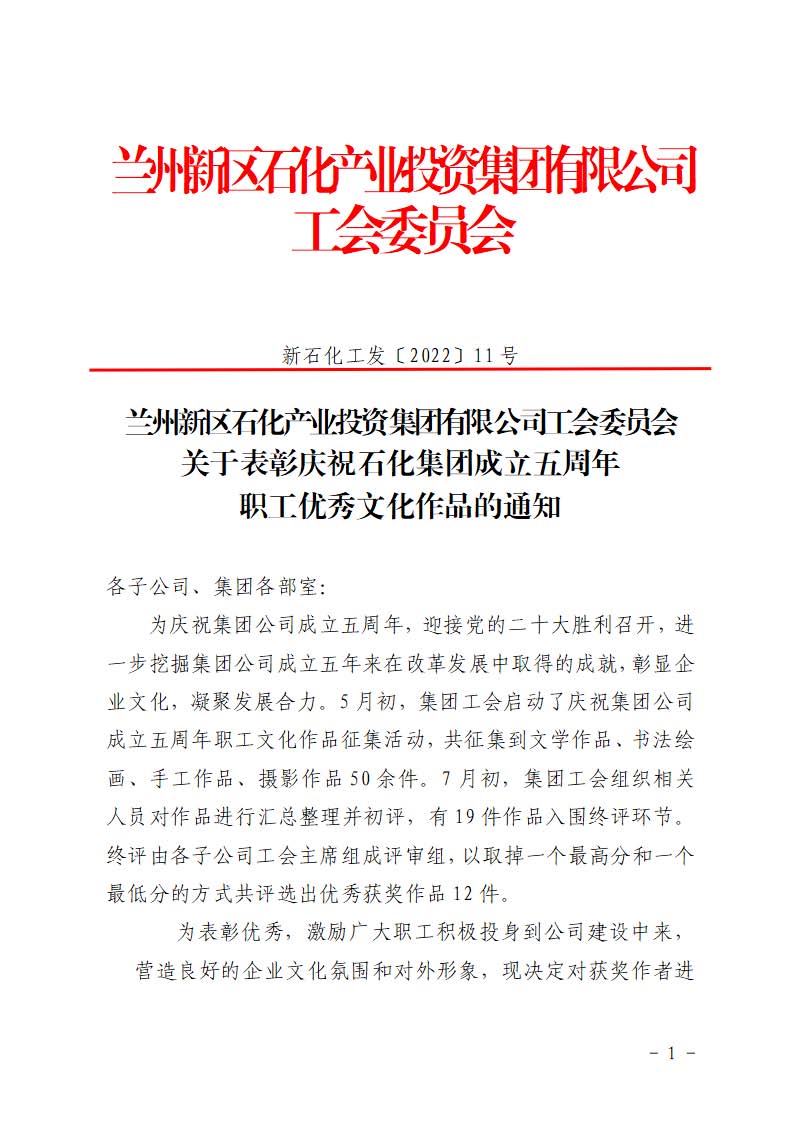 蘭州新區(qū)石化產(chǎn)業(yè)投資集團(tuán)有限公司工會委員會 關(guān)于表彰慶祝石化集團(tuán)成立五周年 職工優(yōu)秀文化作品的通知