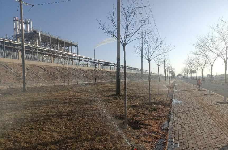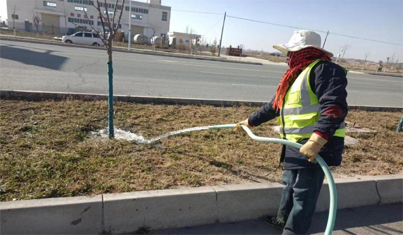 冬灌采用水車澆灌、人工澆灌、噴灌等多種形式確保水分充分滲透到土壤中。同時(shí),加大巡查力度,采取實(shí)地抽樣檢查冬灌滲水深度,對(duì)澆灌不徹底和過度灌溉的綠地要求立即進(jìn)行整改,確保每塊綠地澆灌徹底,使苗木吸收到充足水分,對(duì)新栽植的苗木結(jié)合封凍水在樹木根部培起土堆加強(qiáng)其保溫、保濕效果,目前冬灌正在有序進(jìn)行中。